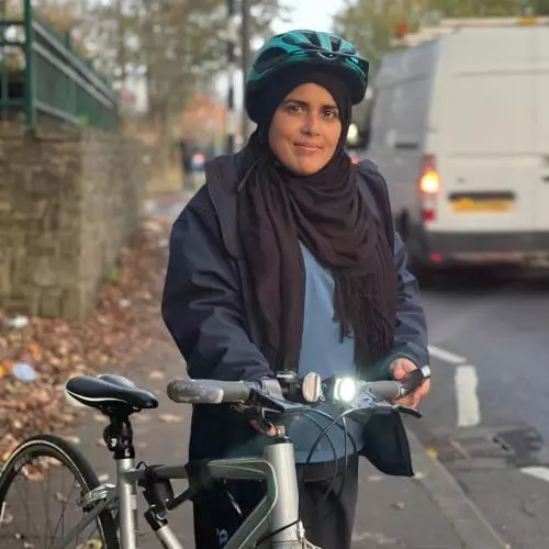 After learning to ride in her 30s, Naz became a Bikeability Instructor and Cycle Mechanic, sharing her passion and expertise with schools and community groups in North Manchester. Through initiatives like the Eid Cycle Fest, Naz fosters a sense of community and joy. As part of the Walk Ride GM steering group, she advocates for safer roads and inclusive cycling spaces.